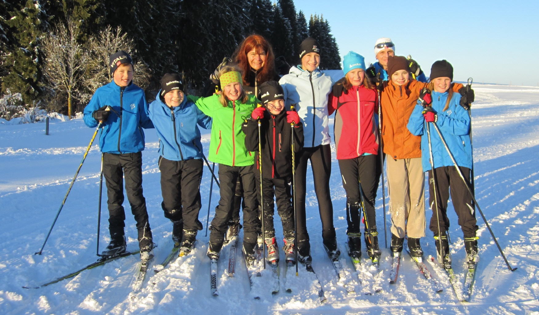 V.l.n.r.: Bettina Rusche, Kilian Geist, Carina Letscher, Julian Simion, Katja Maurus, Paula Helmle, Naomi Wiedemann, Yannik Leckebusch, Max Bölle und Tobias Weizenegger freuen sich mit ihrem Skatingtrainer Anton Maurus und ihrer Lehrerin Elke Matthiesen über die gute Platzierung der Weitnauer Mannschaft beim Langlauf Grundschulwettbewerb.