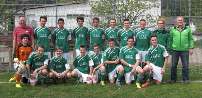 Von hinten links: Philipp Kulmus, Carsten Arndt (Trainer), David Peinl, Moritz Berghofer, Philipp Müller, Denis Morawietz, Nicolas Reggel, Sebastian Enke, Patrick Maier, Rico Preugschat, Christian Weber, Manfred (Sam) Guthsmuths (Trainer) |