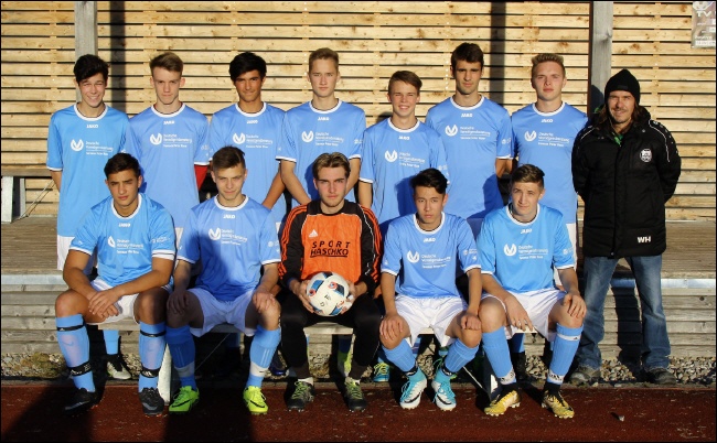 Hinten von links: Ben Sommer, Tim Odenwald, Leon Denzel, Luis Stöhr, Jonas Natterer, Luca Feyel, Dominique Ludescher, Trainer Walter Haas |