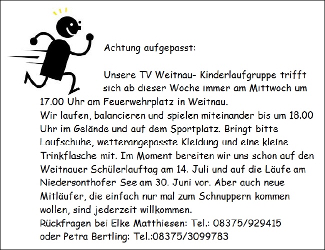 Auch gesammelte Fenebergkassenbelege bitte bei Sabine Schubert in den Briefkasten. An dieser Stelle noch einmal die herzliche Bitte an alle Mitglieder und Freunde des TV Weitnau, von dieser freundlichen Sponsorenunterstützung durch die Firma Feneberg eifrig Gebrauch zu machen. Einfach Kassenbelege der Weitnauer Feneberg Filiale an der Kasse unterschreiben lassen, sammeln und zum Quartalsende bei unserer Schatzmeisterin abgeben. Vom gemeldeten Umsatz bekommt der Verein drei Prozent als Spende, was sich in den letzten Jahren zu einer stabilen Einnahmequelle entwickelt hat.