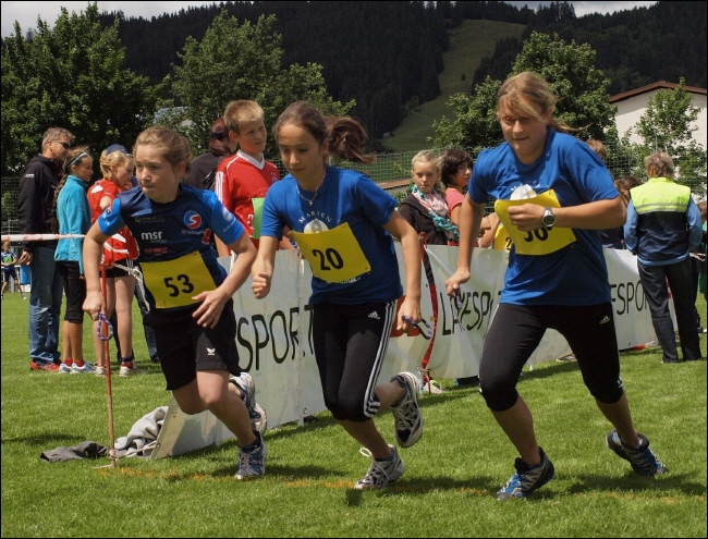 Start zum spannenden Wettlauf der Schülerinnen B - Madelaine Sies von der SG Niederwangen sowie Nicola Müller-Faßbender und Mirjam Simion vom TV Weitnau lieferten sich beim Weitnauer Schülerlauf 2012 mit ihren Partnerinnen ein spannendes Kopf-an-Kopf Rennen.