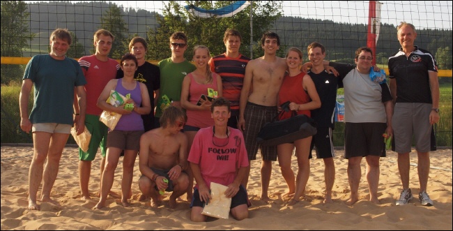 Die Siegerteams des Grümpelturniers, nach einem heißen Beachvolleyballtag, eingerahmt von Vorstand Rainer Hitzler und Bürgermeister Alexander Streicher.