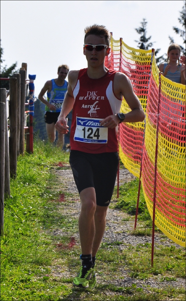Lange Zeit sah es so aus, als ob Vorjahressieger Quirin Schmölz seinen Titel beim 31 Walter-Riedle-Hauchenberglauf verteidigen können würde, doch dann fasste sich ein ganz junges Berglauftalent ein Herz: Bei Kilometer Sechs zog Maximilian Zeus, Jahrgang 1995 von der DJK Weiden einen Zwischenspurt an und Lokalmatador Schmölz aus Missen, der für das Team Laufsport Saukel b_faster antrat, musste abreißen lassen. Im Ziel nach 6,8 Kilometer und 509 Höhenmeter standen für den Oberpfälzer 30:05 Minuten zu Buche, Schmölz überquerte die Ziellinie sechs Sekunden später. Für Zeus, der erst das zweite Mal am Hauchenberg antrat, war es gleichzeitig der Titel des Bayerischen Jugend-Berglaufmeisters. Beide Athleten waren sich einig, dass bei der sommerlichen Hitze der Streckenrekord von 28:08 Minuten nicht drin war, zumal Zeus im Endspurt gegen den acht Jahre älteren Schmölz alles geben musste. Völlig ausgepumpt im Ziel liegend gab es vom Sieger als erstes ein dickes Lob: „Tolle Strecke, tolle Organisation und eine gigantische Aussicht hier oben.“ Eine Aussage über die sich das Organisationsteam um Clemens Krinn und Dieter Herz, mit über 60 freiwilligen Helfern besonders freuen dürfte.