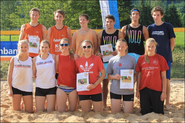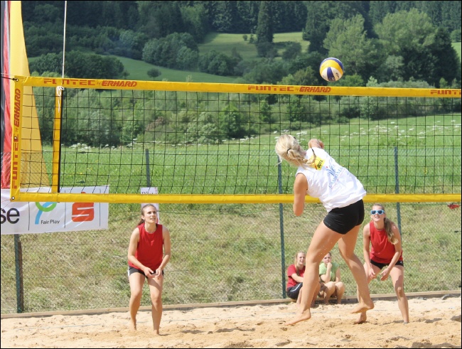 Hobbyteams aus Weitnau, Isny, Kempten, Augsburg oder München hatten am Samstag trotz strömendem Regen ihren Spaß auf den beiden Weitnauer Beachplätzen. Nach einem hart umkämpften Endspiel setzten sich dieses Jahr die „Pöhler“ durch, ein Team das der Weitnauer Volleyballer Felix Hitzler mit Nichtvolleyballern aus Kempten gebildet hatte. Erst im Endspiel musste sich „Freilos“, eine Mannschaft aus dem TSV Röthenbach geschlagen geben, das keinen einzigen Verbandsvolleyballer in seinen Reihen hatte. Den dritten Platz sicherte sich „Sunshine“ das Team um Turnierorganisator Bernhard Hitzler und mit zwei Damen an Bord, das stärkste Mixed-Team. Beeindruckend war für Beachchef Thomas Dölle vor allem, dass „trotz Regen alle angemeldeten 28 Teams angetreten sind und zum allergrößten Teil auch bis zum letzten Platzierungsspiel dabei geblieben sind.“ Am Abend feierten die Sportler zusammen mit Weitnauer Besuchern noch lange bei nostalgischen Klängen der Band „Duplicity“.