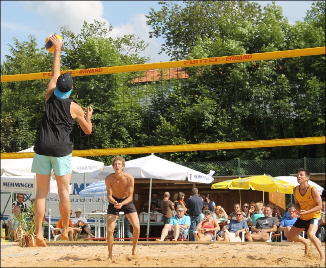 In der Herrenkonkurrenz des Aktiventurniers am Sonntag setzten sich die Sieger von 2011 Jonas Strobel/Roman Vogel aus Weitnau klar gegen das Nachwuchsteam Felix Engstle/Kilian Maidel vom TV Stein durch. Den dritten Platz sicherte sich das neu formierte Weitnauer Team Felix Hitzler/Fabian Hueber, nachdem es Huebers früheren Partner Vinzenz Wilmink nach Argentinien verschlagen hat. Sie setzten sich im kleinen Finale gegen Christoph Schadl/Martin Waibel aus Sonthofen durch, die damit nach 2012 erneut den vierten Platz belegten. Als Sieger der Herzen verließ das Team „ACDC“ den Platz als Zehntplatzierte. Volker Tellermann, der vor vielen Jahren in Weitnau das Volleyballer- und das Zimmererhandwerk erlernt hatte und sein Freund Pitti aus Hamburg, beide schon in den Fünfzigern überzeugten mit kämpferischen Einsatz und großartiger Stimmung auf am Sonntag endlich heißem Sand.