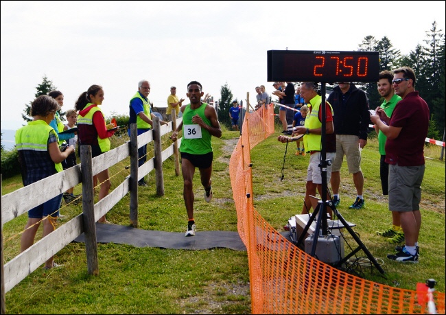 Es sei durchaus sein Ziel gewesen, den Rekord zu brechen. Die Strecke sei „beautiful und schwierig“ erklärte er in einem Mix aus Deutsch und Englisch und deutete mit den Händen die vielen Tempowechsel und die abwechselnd steilen und flachen Passagen an. Der Zweitplatzierte Edwin Singer (TV Erkheim) fasste wenig später die Qualität des Newcomers, von dem man laut Verbandslaufwart Dieter Claus demnächst noch viel hören wird, in wenigen Worten zusammen: „Das ist eine andere Laufdimension“. Auch Vorjahressieger Quirin Schmölz (Sport Haschko), der 2012 den Rekord nur knapp verfehlt hatte, gratulierte fair. Mit Singer war er sich einig, an dem jungen Mann aus Eritrea führte an dem Tag kein Weg vorbei. Der dominierte von Anfang an das hochkarätige Feld; bei Kilometer eins betrug der Abstand zu Schmölz bereits 150 Meter. Allein an der Spitze hielt Tekkle das Tempo hoch, so dass am Ende die Rekordzeit 27:50 zu Buche stand. Spannend wurde es nochmal im Duell um die Plätze. In einem packenden Schlussspurt zog Singer an Schmölz noch vorbei und holte sich wie im Vorjahr Platz zwei. Singer, dessen Vater schon am Hauchenberg gelaufen ist, kommt immer wieder gern nach Weitnau: „Toll organisierter Lauf, tolle Leute – nächstes Jahr gerne wieder!“