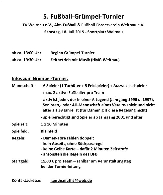 Nachmeldungen bis Samstag 27.06.15 8.30 Uhr: 15 Euro pro Team.