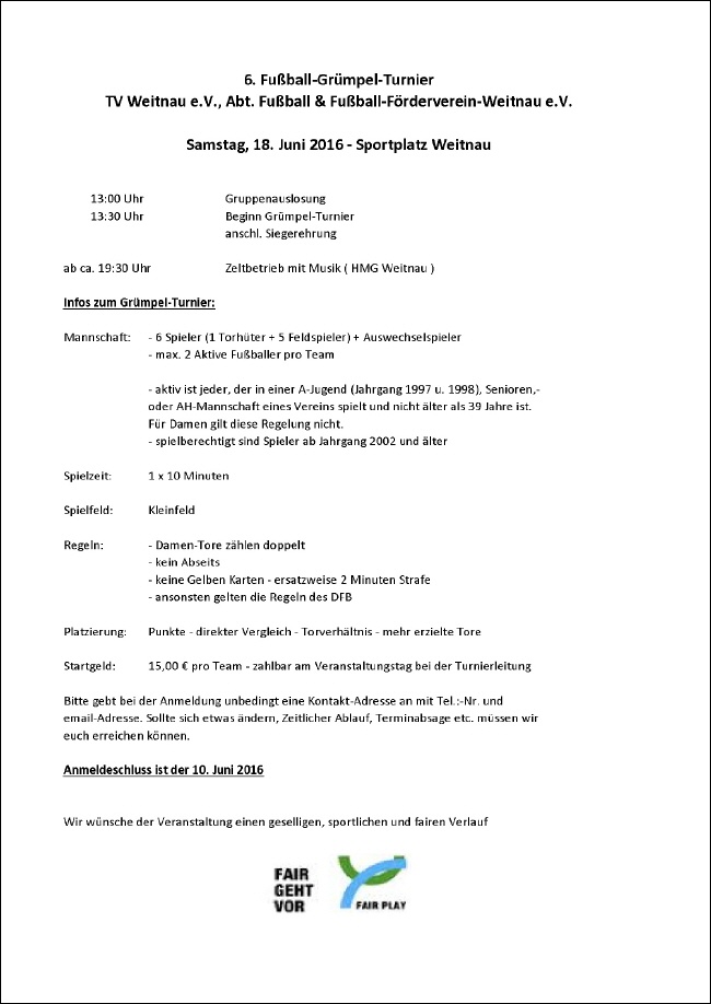Nachmeldungen bis Samstag 25.06.16 8.30 Uhr: 15 Euro pro Team.