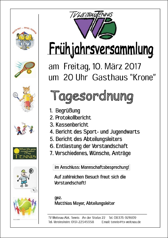 Generalversammlung der Tennisabteilung mit Neuwahlen am Freitag 4. März 2016 um 20.15 Uhr im Gasthaus Krone. Im Anschluss finden die Mannschaftssitzungen der Damen, Damen 40, Herren 40 und Herren 60 statt.