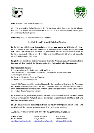 Wir würden uns freuen, wenn wieder möglichst viele Vereine, Ortsteile, Firmen, Familien, Gruppierungen oder wer auch immer Viererteams melden. Der Modus garantiert jedem Team mindestens drei Spiele.